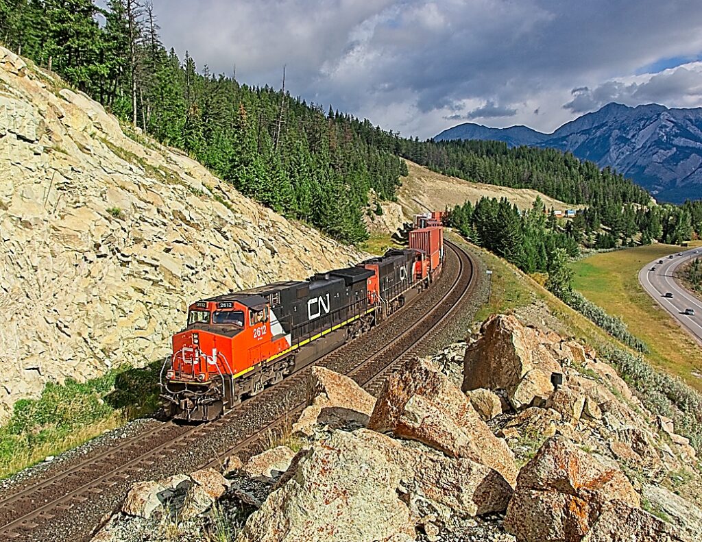 The CN mainline was a thrill for my first time railfanning around Jasper, AB. A friendly wave from the conductor helps make the hike up the hill worth it. CN 2612 (GE C44-9W) and an EMD SD70 lead the Intermodal west to the Yellowhead Pass.