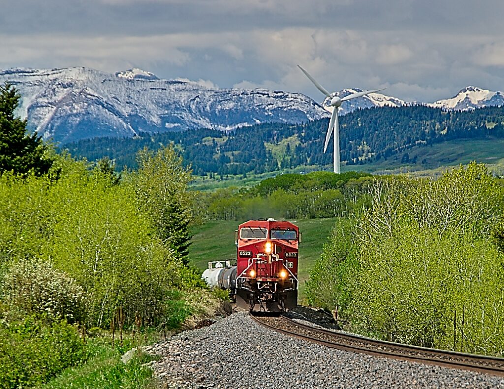Camping at Lundbreck, AB means easy access to trains! Here CP 8523 (GE AC4400CW) drags a manifest up the hill into Lundbreck as it leaves the foothills of the Rocky Mountains behind.