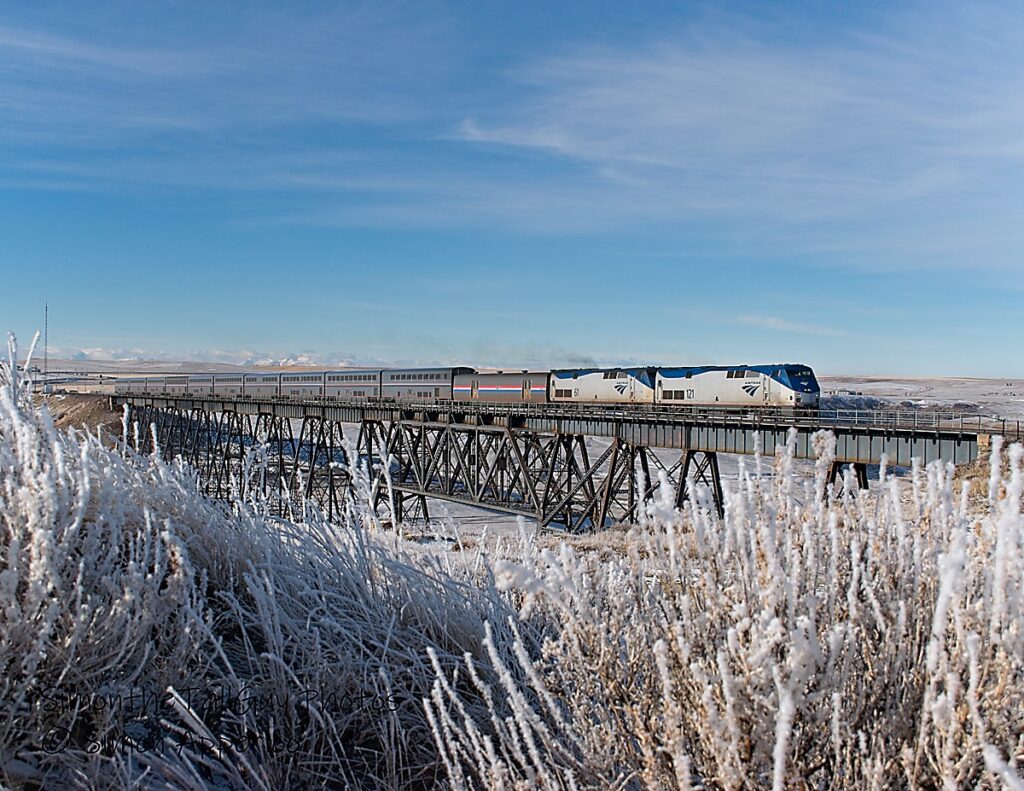 On a frosty fall morning, the Amtrak Empire Builder crosses the trestle in Cut Bank, MT on its way east to Chicago, IL. AMTK 121 (GE P42DC) and AMTK 61 (GE P42DC) both lead the way.