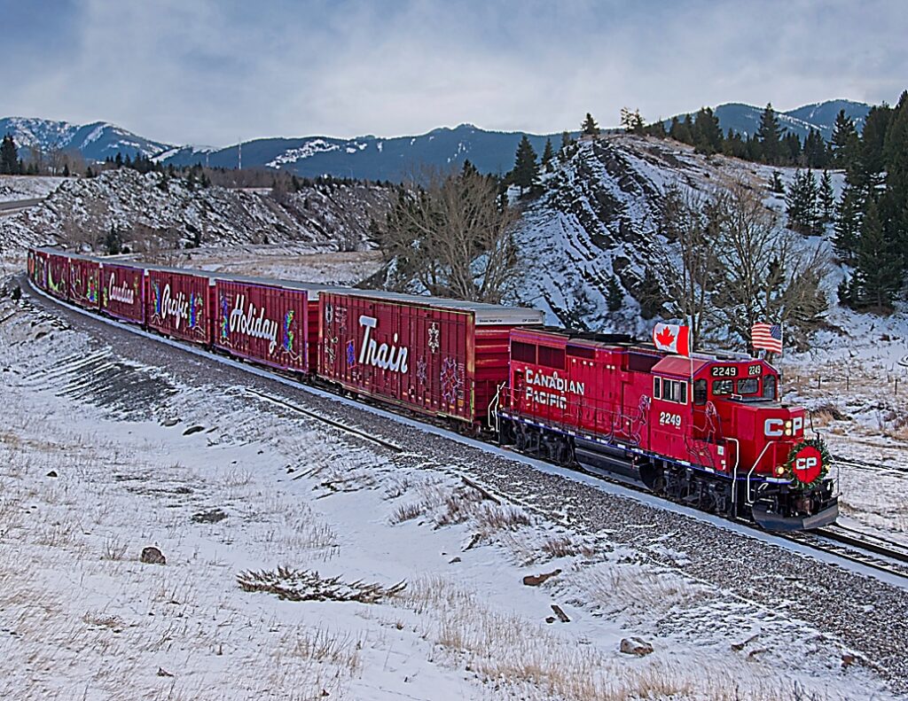 CP’s Holiday train approaches Frank, AB, on a cool, mostly overcast December day. It was an all-day chase from Lethbridge to Sparwood, BC, with stops along the way to enjoy the show in the various towns.