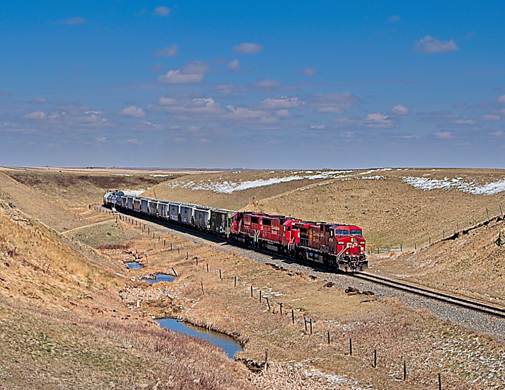 Just north of Warner, AB, the CPKC Montana sub winds its way up from the coulees to the plains. Here CP A08, a southbound manifest lead by CP 9720 (GE AC4400CW), CP 6242 and 6420 (EMD SD-60) grind up the hill on their way to the Montana border.