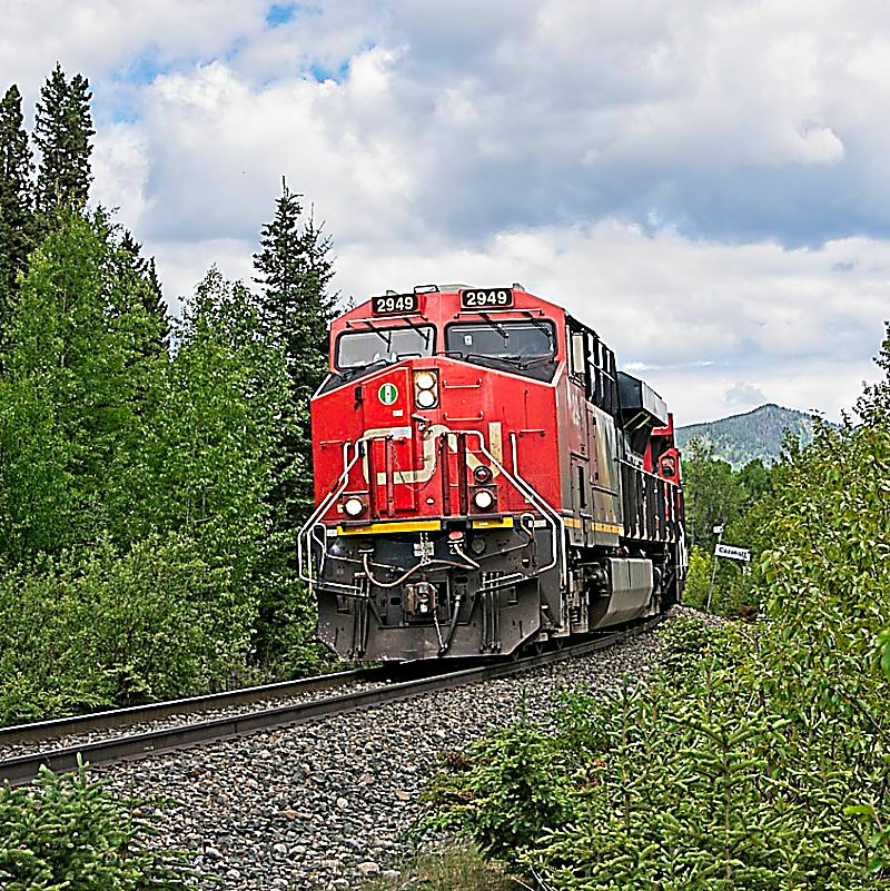 May and June were busy with railfanning trips. May was with AJ and about 10 days later was a trip with Murray and Dan to the Wainwright, AB area. After a few days, Murray and I headed out to Hinton, AB to spend time around Jasper. It was 15 days of railfanning within 25 days! Anyway, Murray and I caught this train coming off the Grande Cache Sub. It was a treat as it had a consist of six locomotives lead by CN 2949 (GE ES44AC).