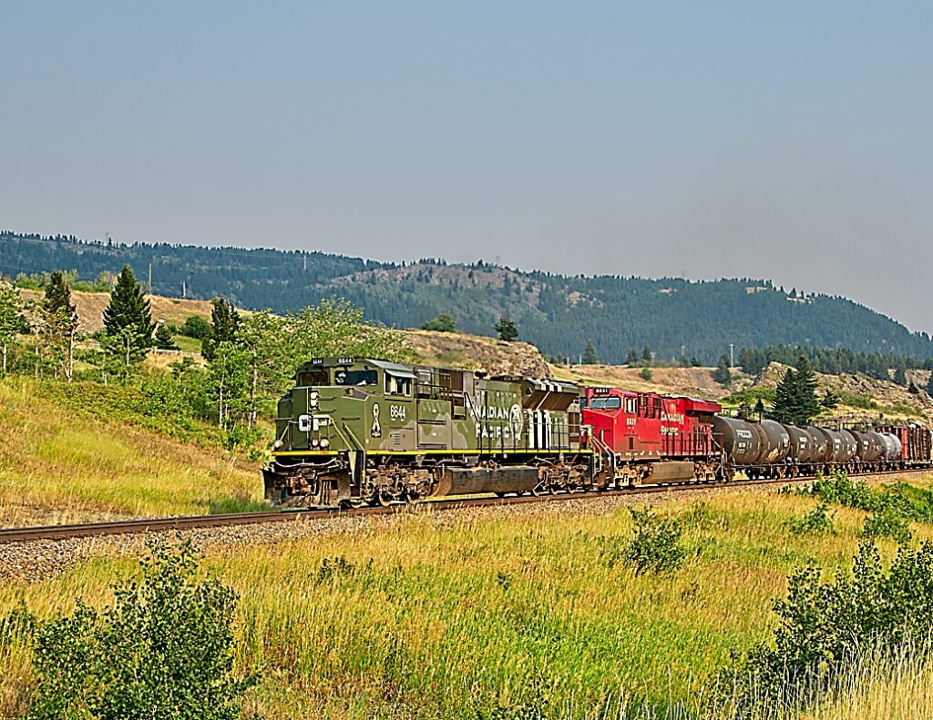 CP 6644 (EMD SD70ACu) is a military tribute unit celebrating D-Day on 6 June 1944. On this day it had the honour of leading CPKC 419, a manifest train, west along the Crowsnest Sub. CP 8931 (GE ES44AC) also pulls at Bellevue, AB.