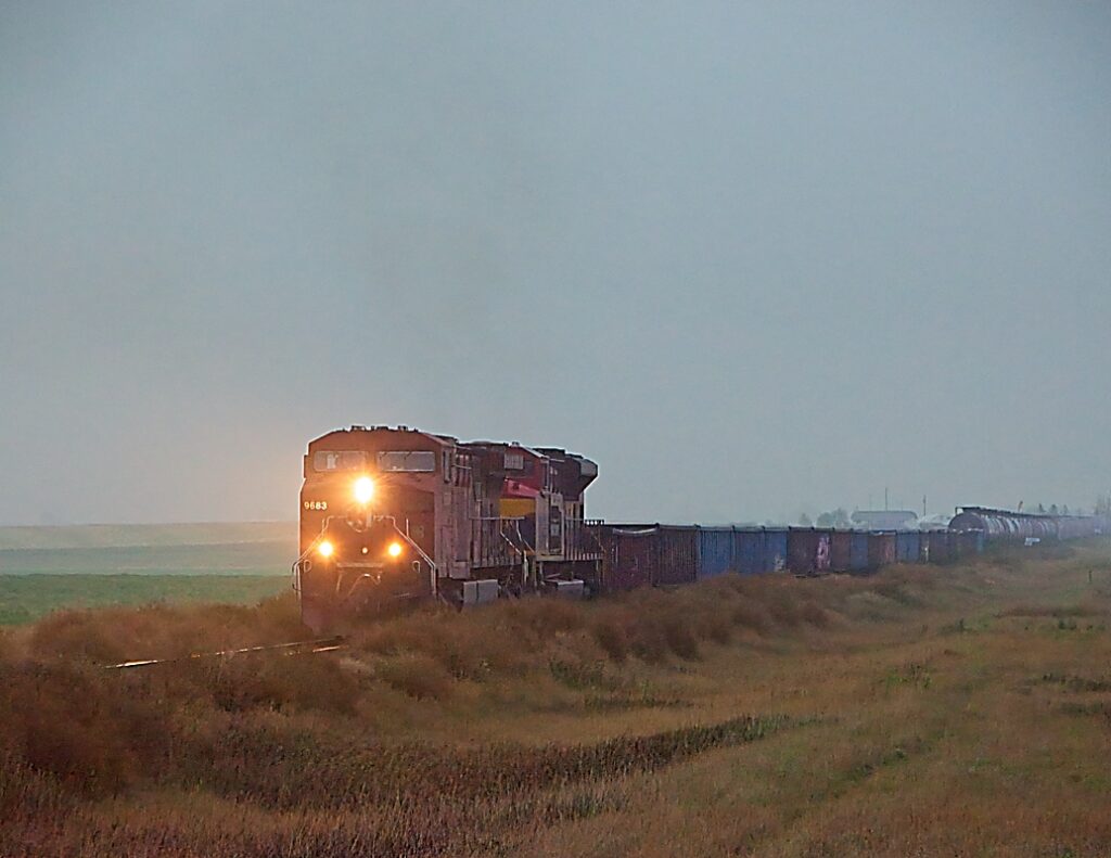 For the last several years, Jason and I have gone for a railfan weekend in October. Often, we go west to the Cranbrook area, but our friend Kevin was away, and Justin had a wedding to go to. So, we decided to head north to Red Deer, AB and explore the CN Three Hills Sub. Shortly after our start from Lethbridge we caught this Manifest train just leaving the yard at Kipp. It was the start of a great weekend exploring new places that we had never been.