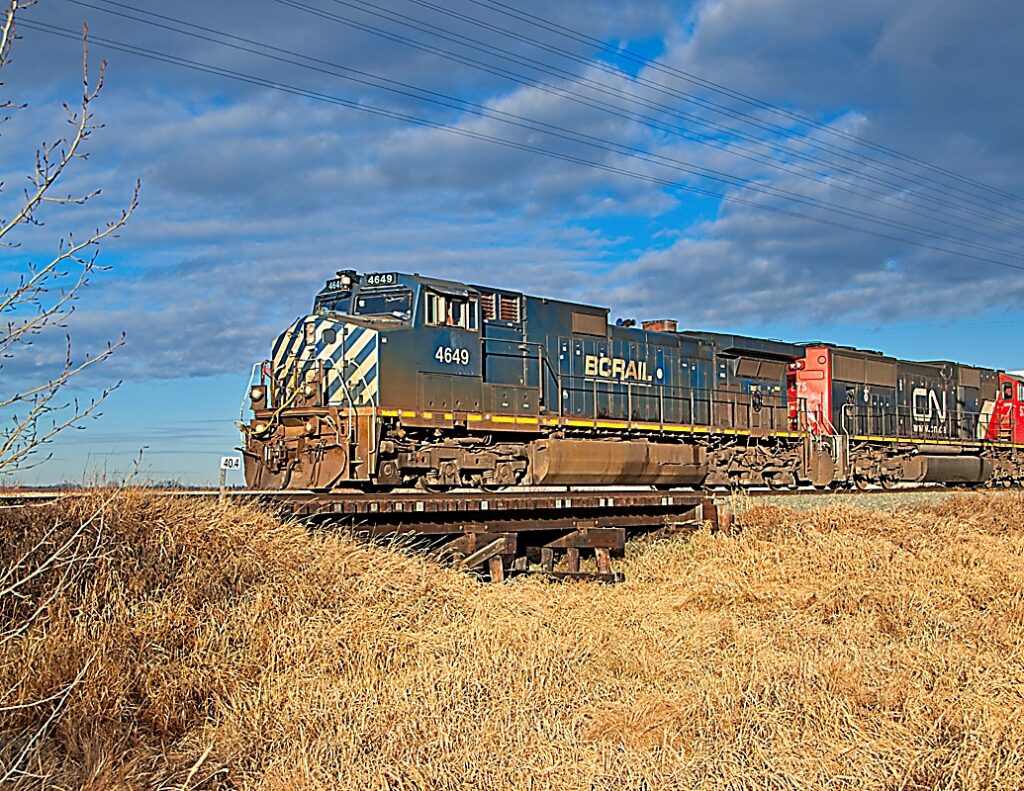 CN 418 is heading south on the CN Westlock Sub north of Edmonton, AB with BCOL 4646 (GE C44-9W) and CN 5775 (EMD SD75I) in the lead. As time has passed many BC Rail units have been retired or repainted into current CN colours.