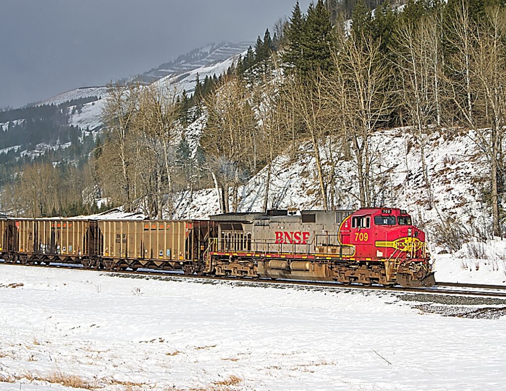 Railfanning is like fishing, you can get skunked or you can get a lucky strike and it is always worth it! Jason and I headed out to catch some coal in the Elk Valley. The day started off with a few troubles, and we did not see a single train on the Crowsnest Sub which stretches from Kipp, AB west to the BC border. But that all changed as we drove down the hill into Sparwood. Parked in the siding at Natal, was a BNSF coal train, with BNSF power on it! To top it off, the remote unit was a “fake bonnet” BNSF 709, (GE C44-9W) which is a slang name given to former Santa Fe units that were not fully repainted into BNSF colours, but just had the name replaced.