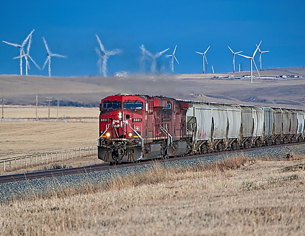 CP 8851 (GE ES44AC) and CP 9725 (GE AC4400CW), pull CPKC 313 made up of 98 Canola hoppers at Cowley, AB.